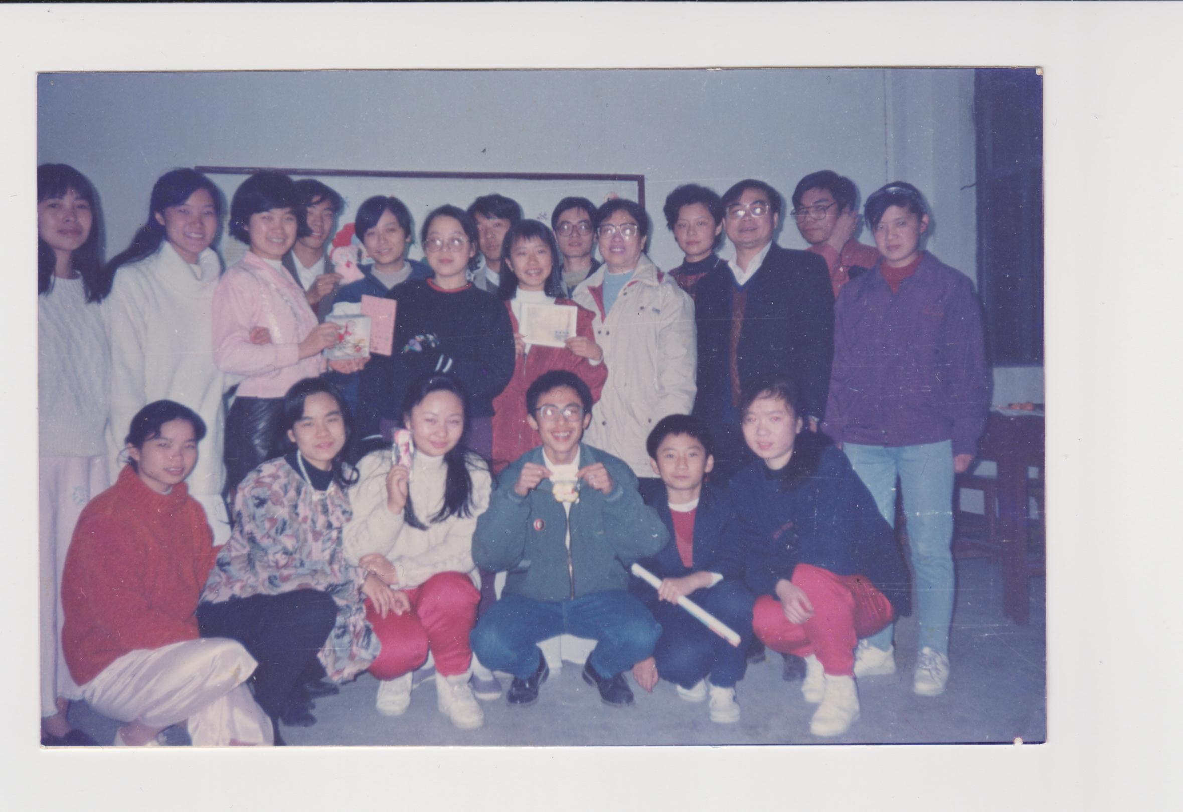 1993年12月25日93级法语班圣诞晚会与陈学吟老师、邱秀贤及邱实合影留念